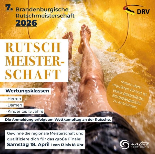 Die nächste Rutschmeisterschaft findet am Samstag, den 18. April 2026 in der Zeit von 14 bis 18 Uhr in der NaturThermeTemplin statt. Die Anmeldung ab 13:00 Uhr erfolgt beim Auslauf der Rutsche beim Bademeister-Team. Anmeldungen sind bis 30 Minuten vor Beginn des Rutschlaufes möglich.