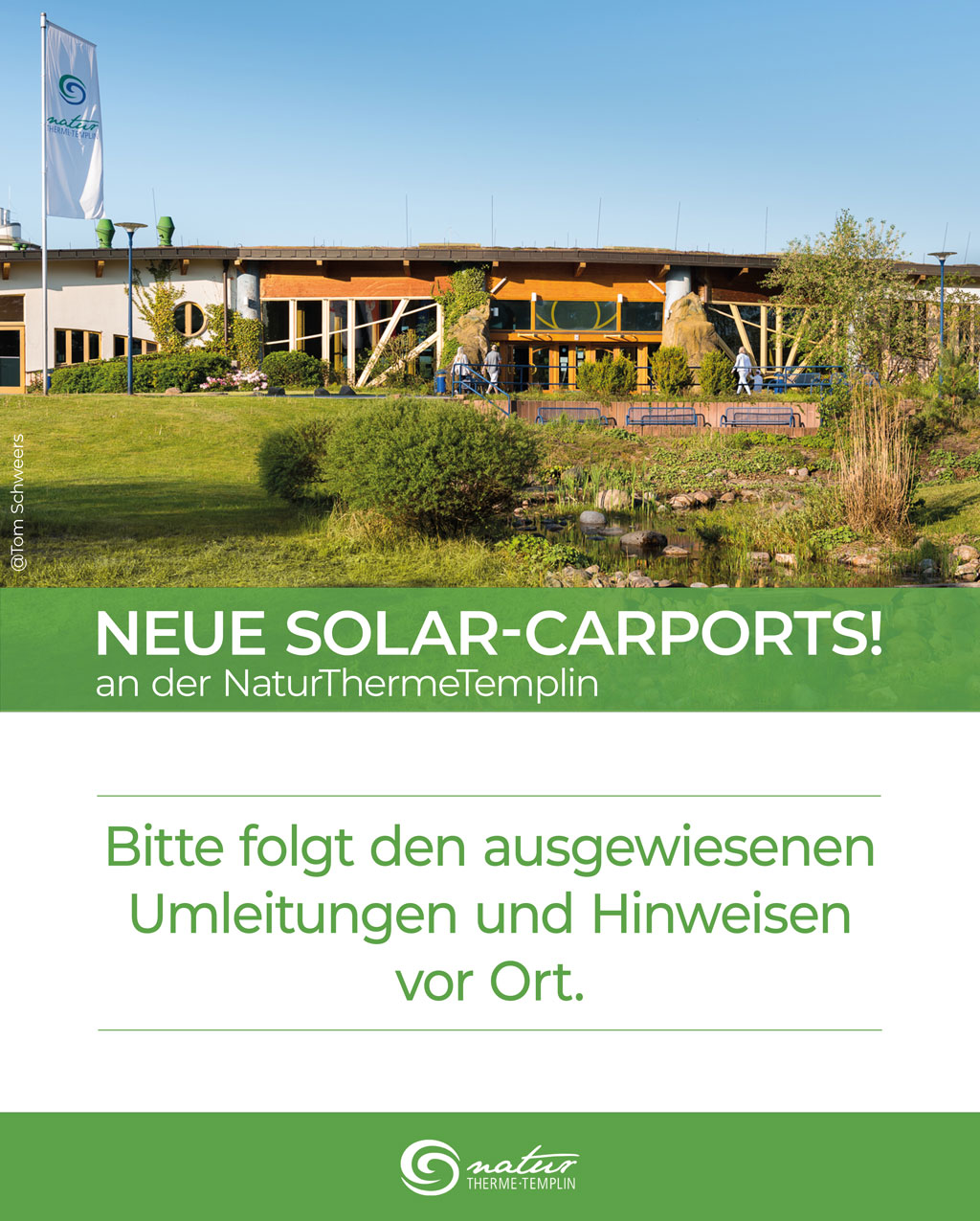 Wegen der beginnenden Bauarbeiten zur Installation von Solar-Carports auf den Parkplätzen der NaturThermetTemplin gibt es ein paar Einschränkungen durch hierfür nötige Absperrungen. Beachten Sie hierzu bitte die Hinweise vor Ort.