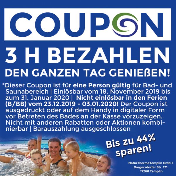 Nur 3h bezahlen und den ganzen Tag in der NaturThermeTemplin genießen! Ab dem 18. November 2019 können Sie bei Vorzeigen dieses Coupons am Einlass Spaß & Entspannung zum Vorzugspreis erleben. Bitte beachten Sie die Einlösebedingungen: Pro Coupon erhält eine Person die Vergünstigung. Den Coupon entweder ausdrucken oder einfach digital auf dem Handy vorzeigen – es darf also gern geteilt und weiter versendet werden 😉