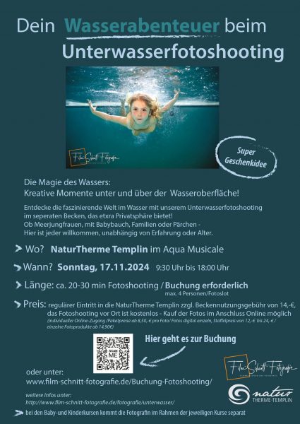 In der NaturThermeTemplin findet am 17.11.2024 ein „Unterwasserfotoshooting“ statt, bei dem Gäste der Therme teilnehmen können (Anmeldung erforderlich).